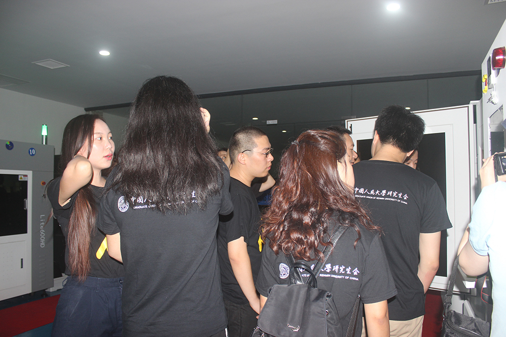 人大師生在陶董事長的帶領下來到了位于公司一樓的3D打印車間。在3D打印車間,陶董事長通過正在工作的工業級SLA成型3D打印機,向人大師生講解了3D打印技術在模具行業的優勢。3D打印技術大大減少了研發成本,促進了制造行業不斷創新發展。