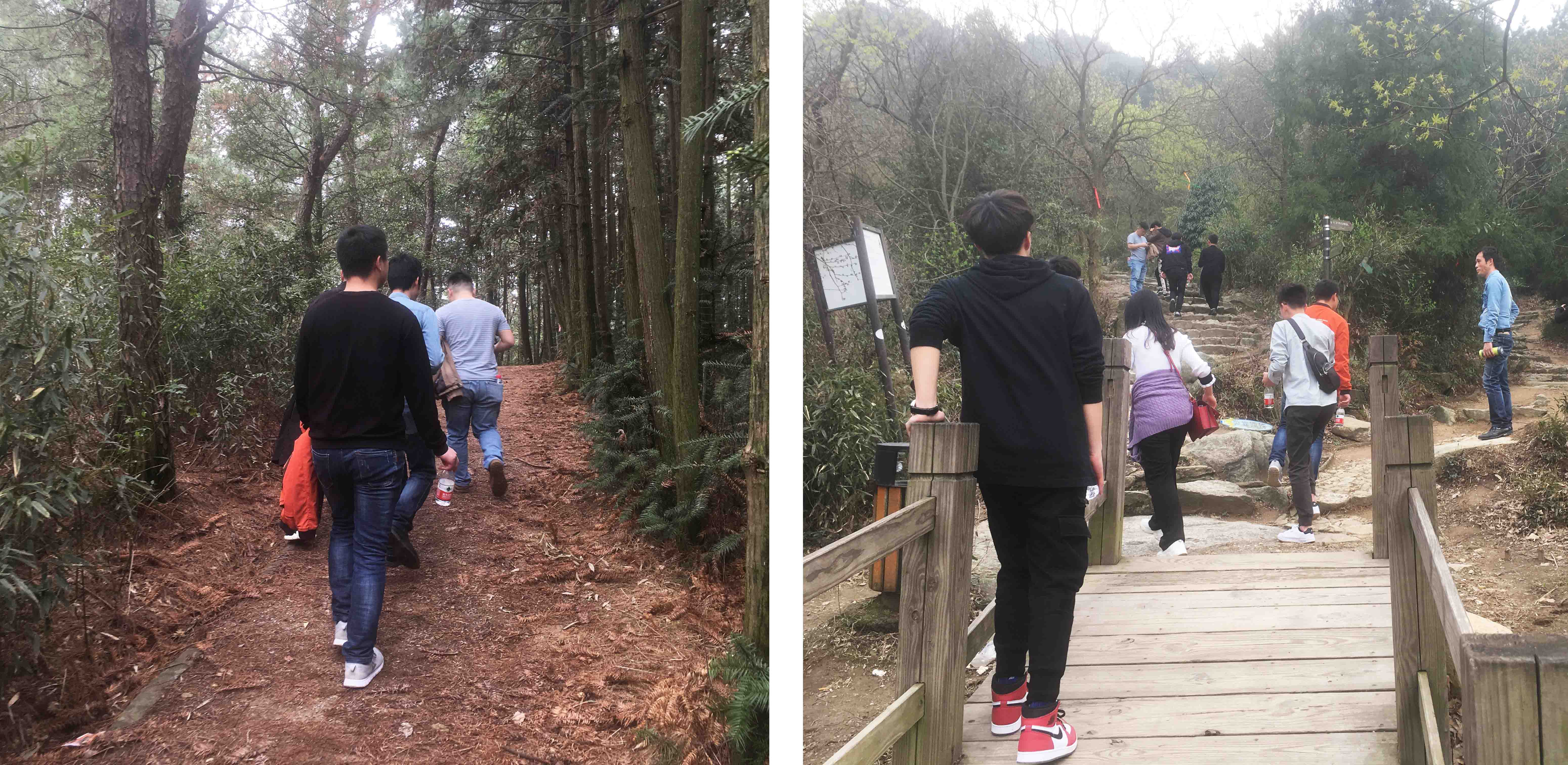 午餐結束小憩修整后,大家坐車到達栲栳山腳下,開啟登山模式。在登山過程中,大家飽覽沿途自然風光;遇到陡坡互相鼓勵,向山頂前行。經過艱難跋涉,大家先后達到山頂,忘卻疲憊,感受大自然的味道,感受大家庭的協助。